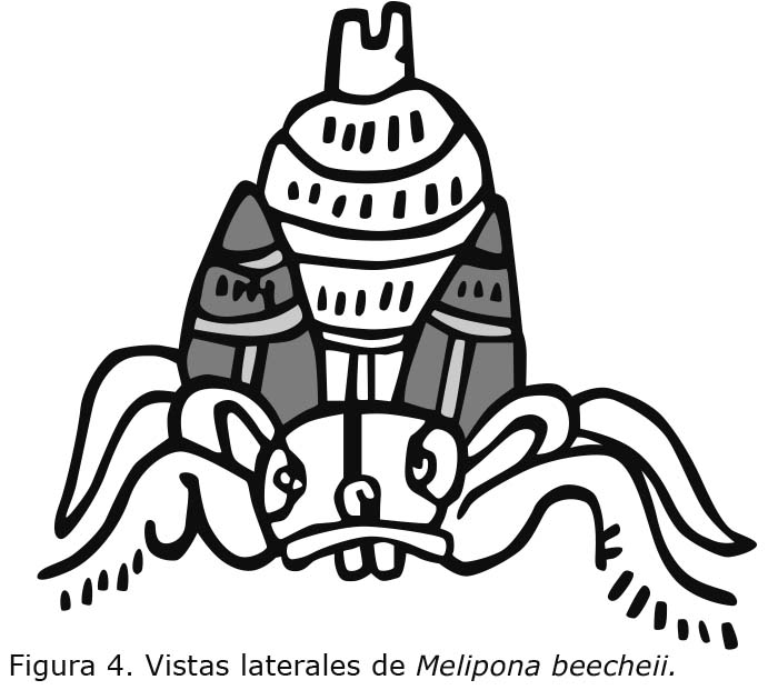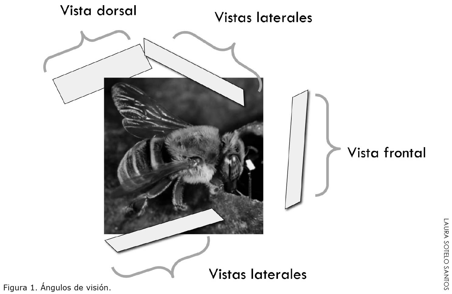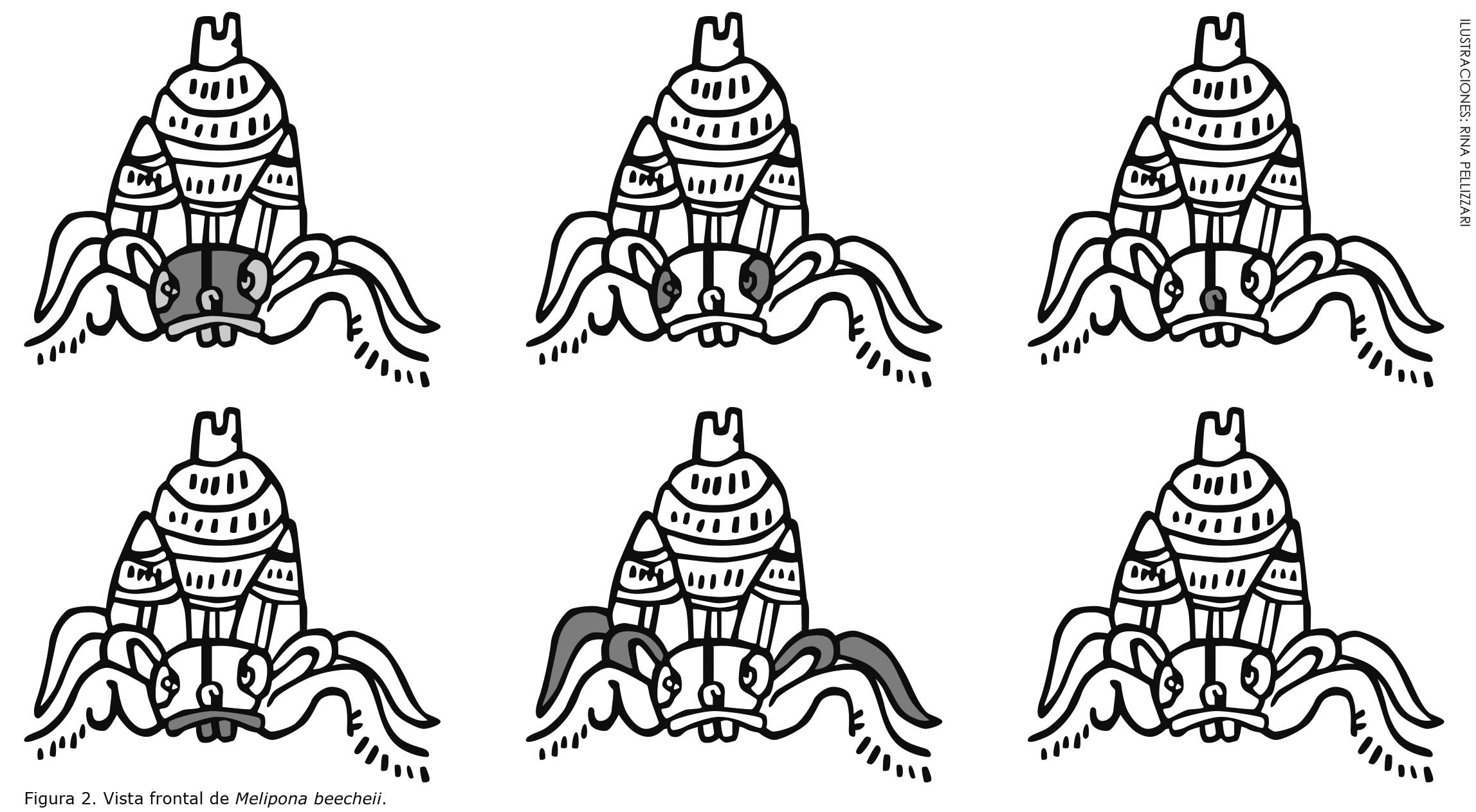 Desde la vista frontal, se observa el “rostro” de la abeja, en el que destacan los ojos compuestos, las antenas, el clípeo, el labrum y las mandíbulas. Además, se miran las patas delanteras con el fémur, la tibia y los tarsos, así como la pilosidad e incluso las “uñas” (figura 3). En la vista dorsal se identifican los tergitos (partes del exoesqueleto), las bandas apicales y la pilosidad, elementos que el autor dibujó con todo detalle (figura 4). En cuanto a las vistas laterales, se integraron las alas a ambos lados del abdomen, se sintetizó su forma mediante triángulos, y su venación se trazó con variaciones en cada una de las abejas. El aspecto más relevante lo encontramos en la abeja reina. Identificamos figuras que la muestran ovopositando, y el huevecillo figura como un pequeño círculo blanco en la hendidura del órgano reproductor.